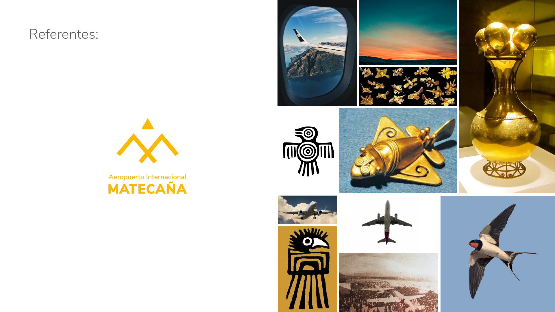 El logo del nuevo aeropuerto de Matecaña pretender encarnar la antigua cultura Quimbaya ubicada desde los años 500 A.C en lo que a hoy se conoce como la región del eje cafetero, por medio de sus mundialmente famosos aviones dorados precolombinos los cuales se creían que son la representación de figuras zoomorfas, sin embargo, por la similitud de algunas piezas con la forma de las aeronaves modernas, algunos investigadores han intentado demostrar que se trataría de modelos de aviones prehistóricos que supuestos visitantes extraterrestres habrían usado para desplazarse en la Tierra.