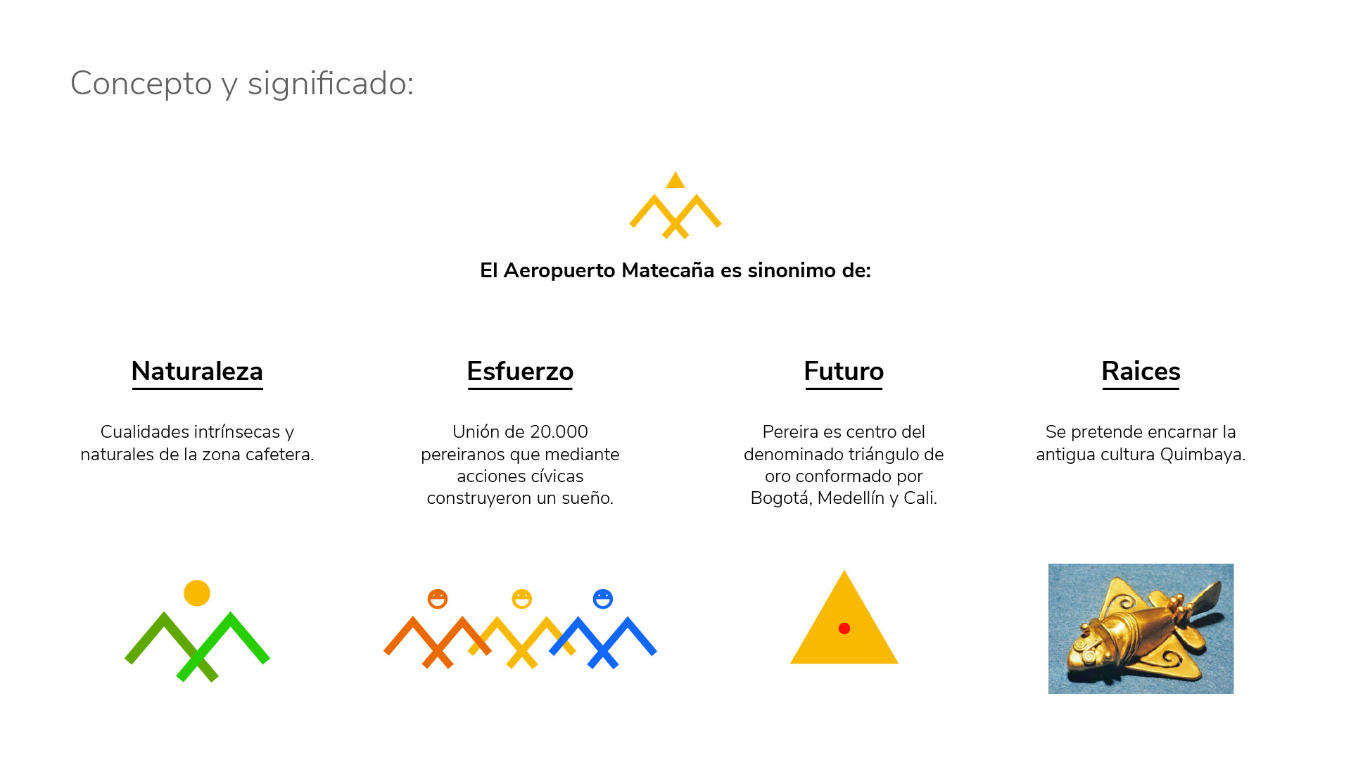 Asi pues, el color amarillo representa los colores de la bandera de Pereira y el oro de los Quimbaya ya que ellos fueron famosos por su producción de piezas de oro de alta calidad y belleza; aleaciones de oro (30%) y cobre (70%). La morfología del logo es la representación de la letra M de Matecaña y es también, la geometrización de un pájaro y un avión que por medio de trazos precolombinos representan la acción de volar.